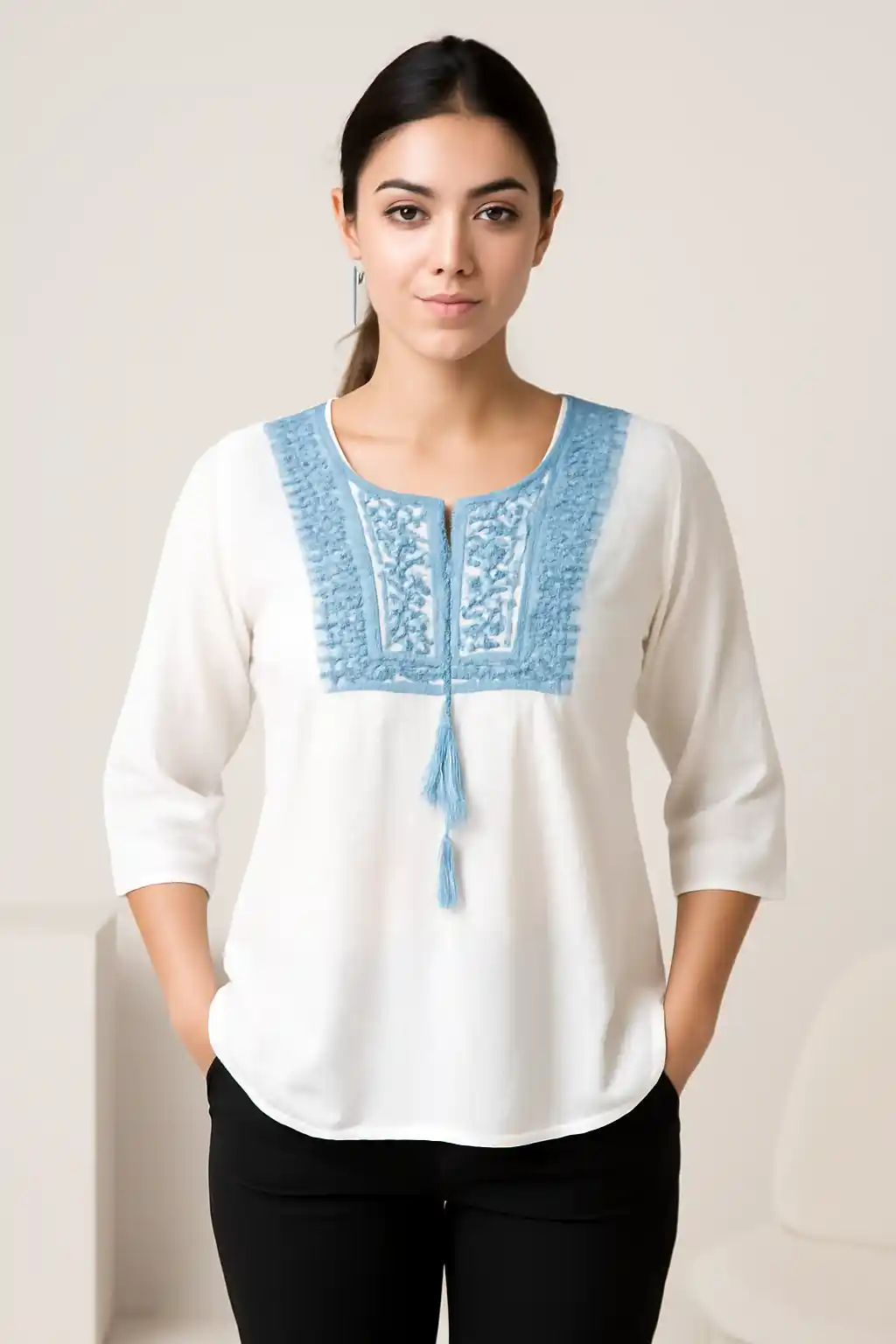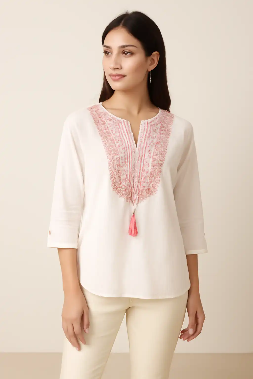Elegant Wgite cotton top with three- quaeter sleeves, featuring delicate embroidery on the neckline and a tassel details for a chic ethnic touch.
