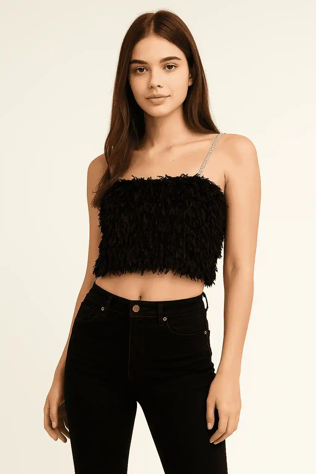 Turn heads with this feathered crop top featuring delicate spaghetti straps and a soft, textured finish — perfect for a night out or a stylish party look.