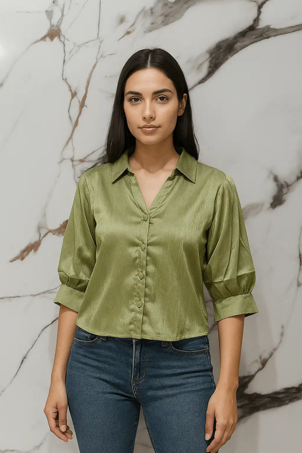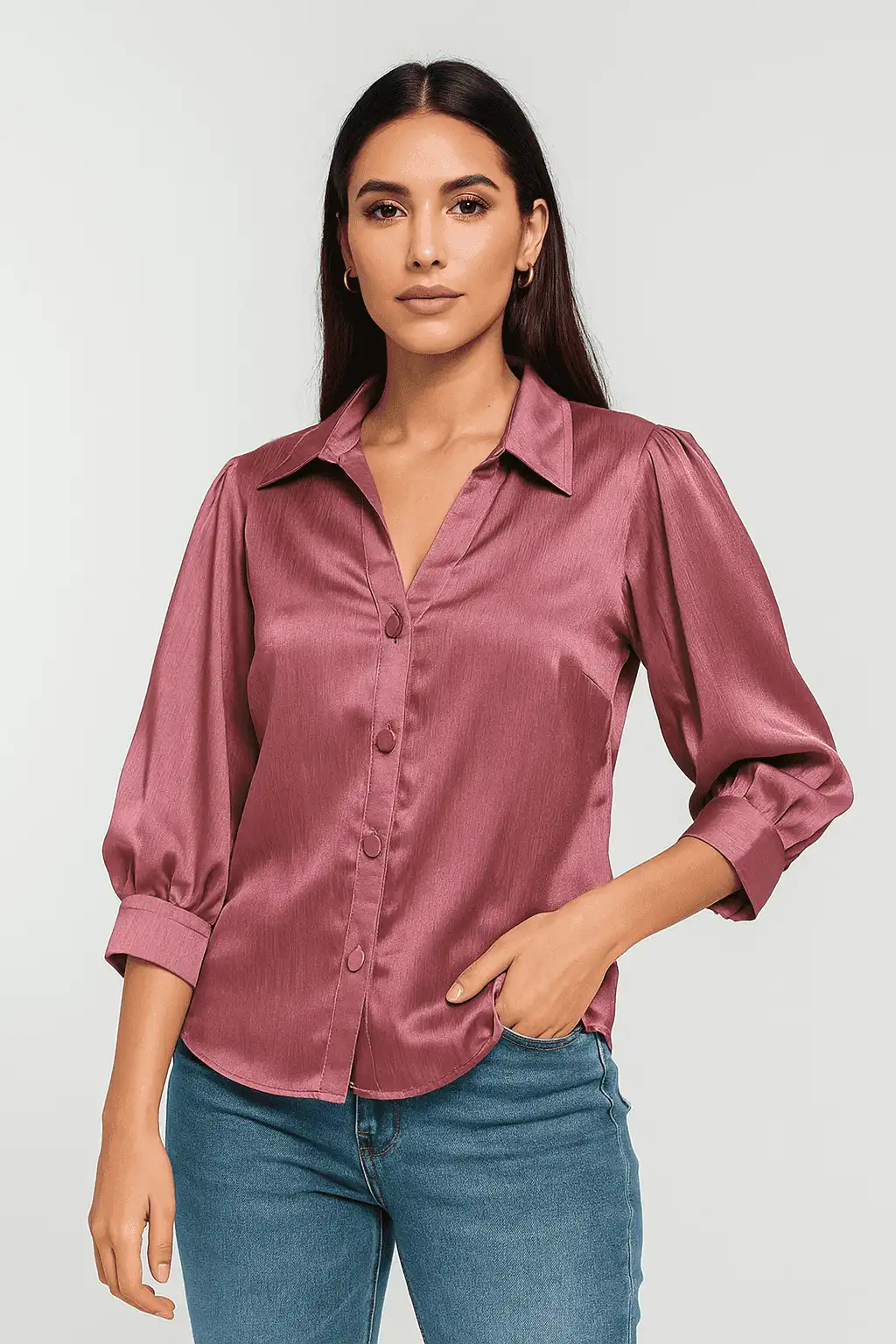 Elegant satin shirt with a classic collar, 3/4 puff sleeves, and a button-down front for a chic sophisticated look.
