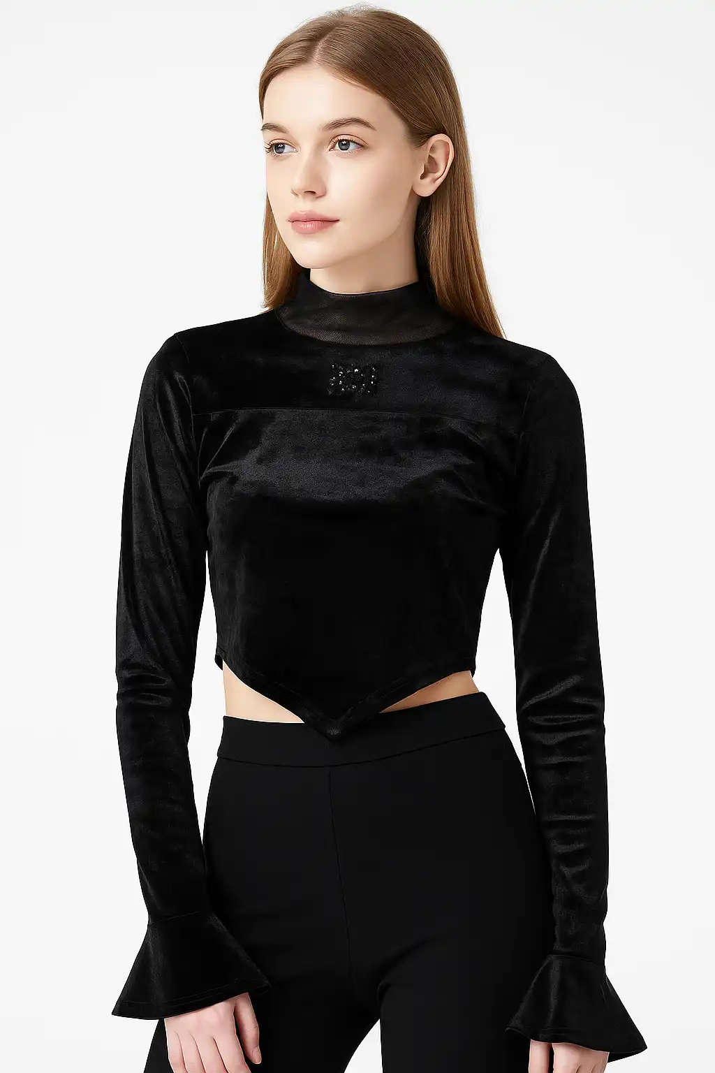 Elevate your look with this chic black velvet full-sleeve top, featuring a high neckline, subtle embellishment, and a stylish asymmetrical hemline that adds a modern edge to classic elegance
