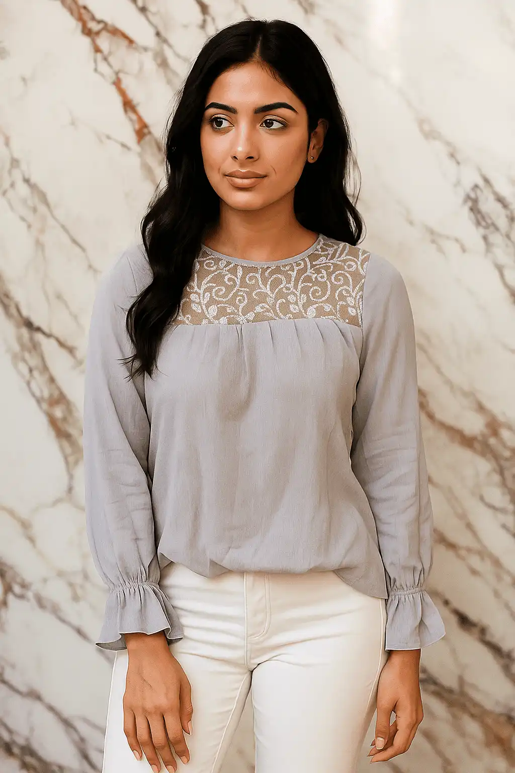 Soft and graceful, this top features a delicate embroidered yoke and a high round neckline. Crafted from a lightweight fabric with 3/4 puff sleeves, it offers a relaxed yet elegant silhouette — perfect for both casual outings and refined occasions.